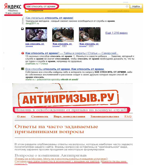 Неконтролируемые государством ресурсы Интернет, дают возможность для работы ресурсам, направленным на очернение армии. В результате наличия в Глобальной Сети на совершенно законных основаниях ресурсов, которые якобы оказывают правовую помощь призывникам давая советы о том «Как откосить от армии» и «Как не ходить в армию». Пример размещения такой информации в сети: