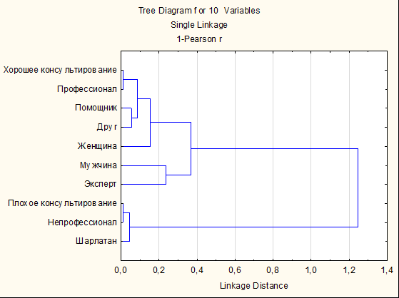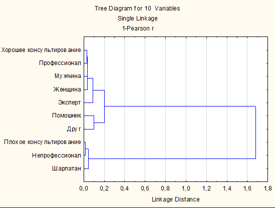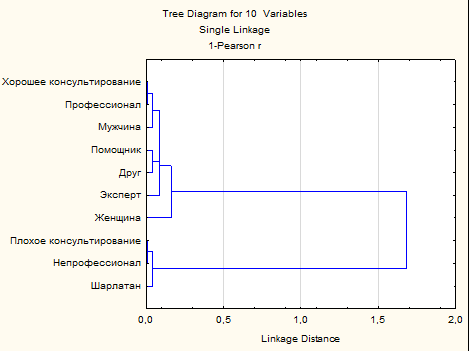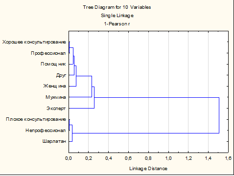 Также кластерный анализ (Рисунок 3) показал, что в ожиданиях испытуемых существует связь между хорошим и профессиональным консультированием, которые связаны с объектами психолог-женщина, психолог-помощник, психолог-друг. По этой причине испытуемые северокавказской группы, скорее, обратятся за помощью к психологу женщине, пойти на контакт с которой им проще. По этой причине она воспринимается как друг и помощник. При этом среди женщин можно поговорить, облегчить душу. В психологе-мужчине они видят психолога-эксперта, так как для их культуры, в общем, характерен образ мужчины, как наставника, инициатора приятия решений.