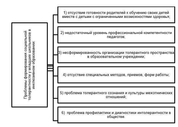 Воспитание толерантной личности – это сложный процесс, осуществляемый всей социальной действительностью, окружающей ребенка, обществом, а также под влиянием взаимоотношений в семье, сложившихся взглядов и отношений ее членов к другим людям и обществу в целом, под влиянием общения со сверстниками и окружающими людьми. Необходимо каждого человека уже с раннего возраста приучать к нравственному отношению ко всем окружающим, независимо от причины, отличающего одного человека к другому. Формирование толерантной личности на всех возрастных этапах имеет равноправную значимость. В младшем школьном возрасте закладывается фундамент нравственного поведения, происходит усвоение моральных норм и правил поведения, начинает формироваться общественная направленность личности, развитие эмоционально-волевой сферы. В задачах духовно-нравственного развития и воспитания обучающихся на ступени начального общего образования обозначена необходимость формирования толерантности как одной из составляющих развития социальной культуры обучающихся. Анализ теоретических источников по проблеме формирования социальной толерантности у младших школьников в условиях инклюзивного образования позволил выделить ряд проблем, представленных на рисуне 2.