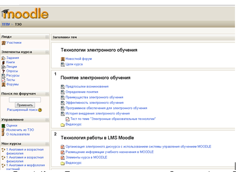 Рис. 1. Курс «Технологии электронного обучения» (разработчик к.ф.-м.н., доцент Родионова О.В.)