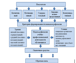 Разработанная нами модель рефлексии учебно-профессиональной деятельности обучающихся включает в себя следующие составляющие: критерии, показатели и уровни сформированности навыков рефлексии; условия эффективного формирования рефлексии и оценочные средства.