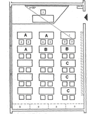 В классе 3 ученика страдают близорукостью (А), 2 человека имеют сниженную остроту слуха (В), 3 человека имеют сниженный иммунитет (С) и часто простужаются. Отметьте на схеме, где должны сидеть эти учащиеся в классной комнате в соответствии с санитарно-гигиеническими правилами рассаживания учащихся.