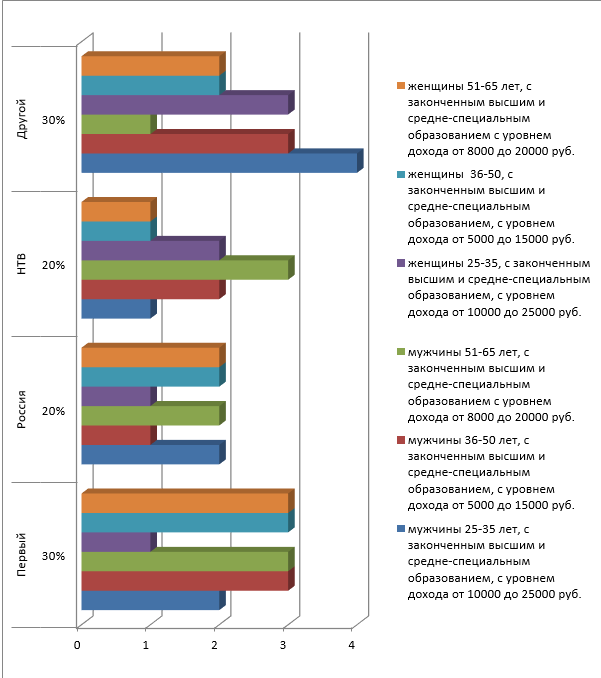 Анализ результатов опроса показал, что наиболее предпочитаемый потребителями - канал «Первый» - 30%, 20% предпочитают канал «Россия», 20% - «НТВ» и 30% предпочитают другие каналы.