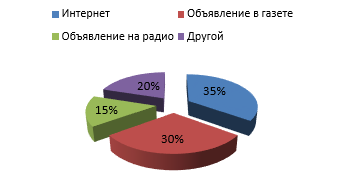 Большинство опрашиваемых (35%) высказались за получение информации посредствам интернета. Также большое количество покупателей (30%) предпочитают узнавать о новшествах магазина из объявления в прессе. Небольшое количество человек выбрали объявление на радио (15%) и другие способы получения информации (объявление на витрине магазина, СМС-оповещение и т.д.).