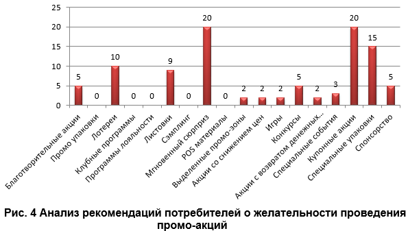 Большинство опрашиваемых покупателей (20%) высказались за проведение купонных акций и акций с мгновенными сюрпризами. Также заинтересовали потребителей акция со специальной упаковкой (15%) и проведение в магазине лотереи (10%).