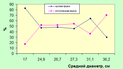 В случае использования критерия отклонения наблюдалось резкое изменение в проценте деревьев круговой формы с 82,8% при среднем диаметре 17 см до 48,0 % при среднем диаметре 24,9 см. Как известно в начальный период роста растения характеризуются округлой формой поперечного сечения, поэтому такая закономерность естественна.