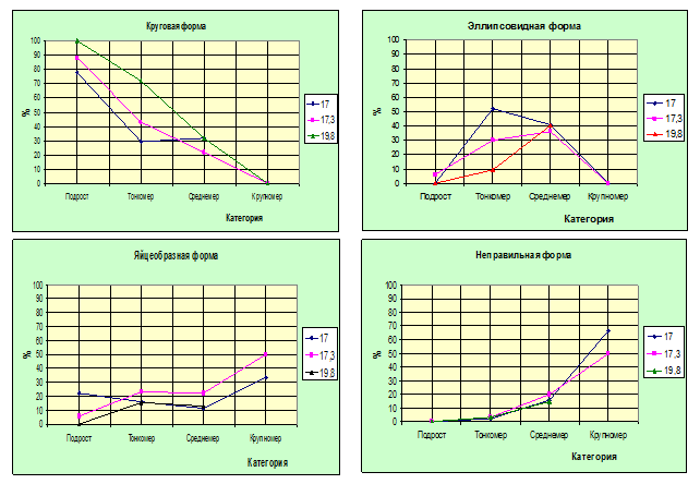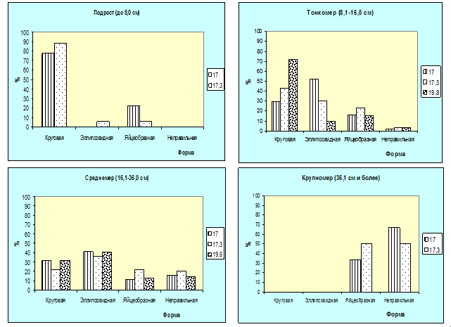 Общая закономерность заключается в уменьшении со временем деревьев круговой формы и устойчивое увеличение стволов с неправильной формой. Деревья яйцеобразной и эллипсовидной формы имеют нестабильный процент, который определяется локальными особенностями конкретных насаждений.