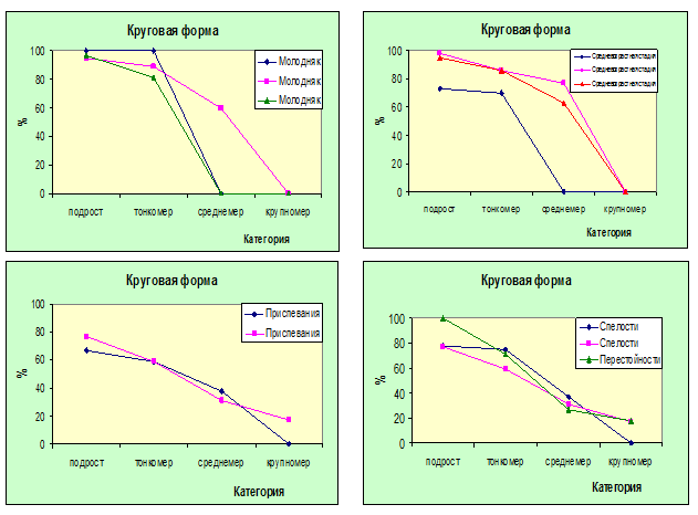 Исследования проводились по следующим возрастным стадиям: молодняка, средневозрастности, спелости, перестойности. Процентное соотношение деревьев позволило выделить две характерные закономерности в форме стволов. В молодых насаждениях (стадии молодняка, средневозрастности) происходит первоначально равномерно-постепенное уменьшение деревьев круговой формы (подрост, тонкомер) и затем резкое снижение (среднемер, крупномер). В возрастных насаждениях (стадии приспевания, спелости, перестойности) процент деревьев круговой формы наблюдалось постепенное снижение процента деревьев с круговой формой от подроста до крупномера (рисунок 4).