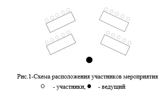 Разместить студентов необходимо по группам так, чтобы между «столами» можно было осуществлять взаимодействие, все участники мероприятия могли видеть экран и проецируемые на него иллюстрации, всем командам было видно модератора мероприятия (ведущего) (рисунок 1).