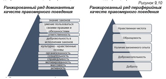 Так как представления о правомерном поведении, существующие в сознании участников анкетирования, дифференцируются по ряду критериев, то они требуют специального изучения с последующей интеграцией. Методом обобщения составлен ранжированный ряд доминантных и периферийных качеств правомерного поведения в представлении всех участников анкетирования. Доминантные: знание действующих законов, умение пользоваться своими правами и обязанностями, ответственность, добровольность в исполнении законов, культурно – нравственная основа, организованность, сознательность, справедливость, мотивированность, массовость, активность. Периферийные: нравственная чистота, доброжелательность, образцовость, жизненный опыт, доброта, скромность.