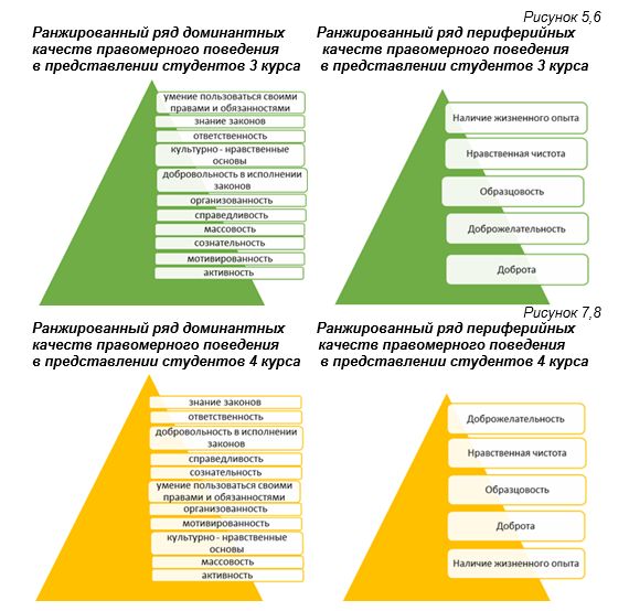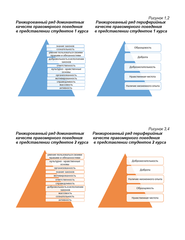 Используя авторскую методику, четырем группам (студентам 1 курса, студентам 2 курса, студентам 3 курса, студентам 4 курса) было предложено проранжировать основные качества, черты правомерного поведения, необходимого для благоприятного функционирования правовой системы и социума. На основании полученных данных, составлены ряды ранжированных качеств правомерного поведения с разделением на доминантные и периферийные.