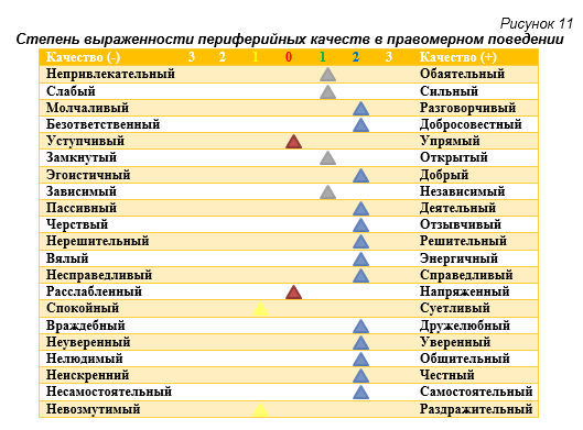 По методике качественного дифференциала, делающей упор на периферийные качества, определенна степень их выраженности в правомерном поведении. Для этого в процессе анкетирования, респондентам представилась возможность выразить свое мнение по этому поводу. Проанализировав результаты, выделены общие черты среди наиболее выраженных качеств: добросовестность, деятельность, решительность, энергичность, справедливость, дружелюбность, уверенность и честность. Все участники опроса определяют слабо выраженными или невыраженными вовсе уступчивость/упрямство, расслабленность, напряженность. Но в отношении некоторых других показателей мнения расходятся. Студенты 3 курса придают большее значение открытости. Студенты 4 курса в менее выраженной степени определяют доброту, чем студенты 1,2,3 курсов. Общительности большее значение придают студенты 2,3 курсов. Более всего самостоятельность ценят студенты 3 курса, меньшее значение ей придают студенты 4 курса. И к минимальному сводят этот показатель студенты 1, 2 курсов. В отношении невозмутимости мнения так же расходятся: студенты 1,2 курсов считают эту позицию невыраженной, чуть большее значение придают ей студенты 4 курса, и наибольшее, по сравнению с остальными, - студенты 3 курса.