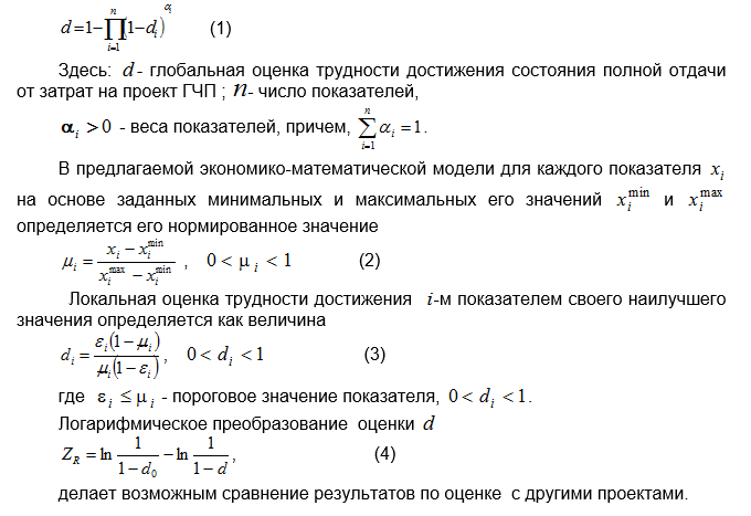 Для общей оценки социальной эффективности можно использовать экономико-математическую модель, разработанную И.Б. Руссманом, для оценки трудности достижения максимальной отдачи от затрат на ОЦП, и, следовательно, приблизиться к такой оценке отдачи, в которую можно включить бесконечное число элементов, входящих в проект ГЧП.