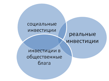 Для того чтобы инвестировать в общественные блага необходимо производить инвестиции в их производство. Инвестиции в общественные блага имеют вид вложений, ставящих своей целью увеличение социальной ориентации системы экономики, получение определенного эффекта для людей. Взаимосвязь между различными видами инвестиций показана на рис. 1