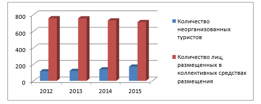 Динамика туристических потоков Ростовской области в 2012-2015 гг. приведена на рисунке 1.По данным Территориального органа Федеральной службы государственной статистики по Ростовской области, численность неорганизованных посетителей Ростовской области в 2015 году на территории Нижнего Дона и Приазовья увеличилась по сравнению с 2013 годом на 42,8 процента и в абсолютном выражении составила 171,3 тыс. человек. Последнее отражает рекреационную привлекательность территории Ростовской области и перспективы развития бюджетного семейного отдыха. Но наряду с этим отмечается, что за 2015 год количество туристов Ростовской области, воспользовавшихся услугами коллективных средств размещения, сократилось по сравнению с 2013 годом на 5,9 процента и составило 710,2 тыс. человек. На снижение турпотока повлияли процессы экономического спада, применение санкций, повлекшие снижение доходов населения и некоторый рост цен на услуги коллективных средств размещения [2].
