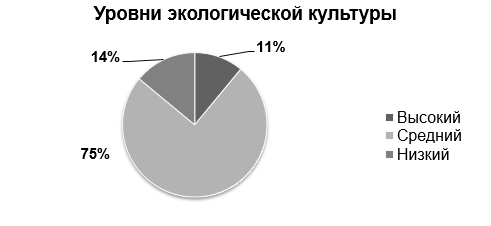 Как видно из диаграммы, у испытуемых преобладает средний уровень экологической культуры (75 %), для которого характерно проявление интереса к познанию природных явлений и сохранению среды обитания, осознание важности экологии для здоровья и полноценного развития человека и природы, активное участие в экологической деятельности. При этом деятельность учащихся носит целенаправленный практический характер, который проявляется в конкретной работе по озеленению школ, изготовлению кормушек, уходу за памятниками природы и охраняемыми объектами и т.д. Стоит отметить, что дети не демонстрируют достаточно обширные и глубокие знания по вопросам экологии.