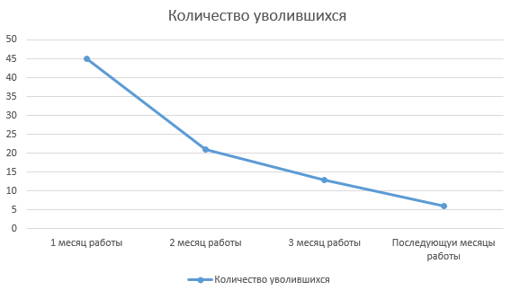 За последние 3 месяца по статистике в компанию принято 117 новых сотрудников, из которых отработали первый месяц 72 человека, остальные уволились по собственному желанию. Второй месяц отработал 51 человек. И третий месяц отработали 38 человек, тем самым закончили стажировку и полноценно вступили на должность специалиста, что составило 32% от общего числа специалистов, принятых на работу.