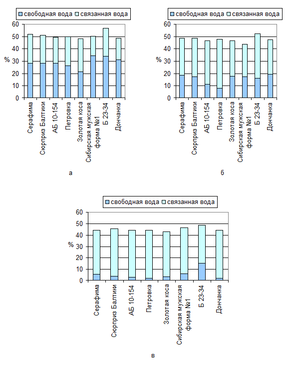 Рисунок 1 – Динамика содержания свободной и связанной воды в однолетних побегах облепихи крушиновидной в октябре (а), в ноябре (б), декабре (в), %