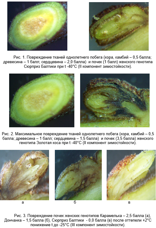 Растения облепихи в марте во время продолжительных оттепелей выходят из вынужденного покоя и могут повредиться возвратными морозами. По результатам проведенного эксперимента в основном все генотипы облепихи крушиновидной проявили устойчивость почек, коры и древесины к морозу до -30°С после оттепели +2°С и повторной закалки (IV компонент зимостойкости). У них отмечены обратимые повреждения до 2,0 балла. У сорта Карамелька почки повредились до 3,0 балла. У Сибирской мужской формы №1 почки сильно повредились морозом после оттепели и повторной закалки – 3,4 балла (табл. 1).