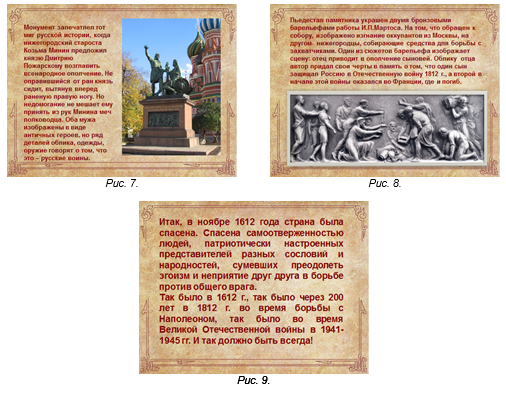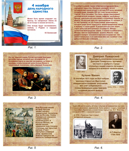 Игровые моменты можно применять как в учебной деятельности, так и во внеклассной работе, интегрируя мероприятия в предметной неделе учителей истории и математики. Темы уроков или внеклассных мероприятий могут быть различными: посвященные какой-либо исторической дате, либо конкретно по тематическому планированию учителей истории, математики, например, «День национального единства (история создания памятника К. Минину и Д. Пожарскому в Москве)» (рисунок 1), «Введение в метрологию: Старинные меры длины, объема и веса (цикл уроков для 5-6 классов)», «Образование в эпоху Петра I», «Царь Колокол», «Царь Пушка» и т. д.