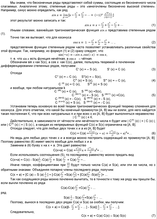 Для доказательства различных свойств тригонометрических функций есть масса интересных способов. В школьном курсе математики тригонометрические функции впервые вводятся в курсе геометрии, как отношение определенных сторон прямоугольного треугольника. Но есть и другие методы определения этих функций, например, через степенные ряды.