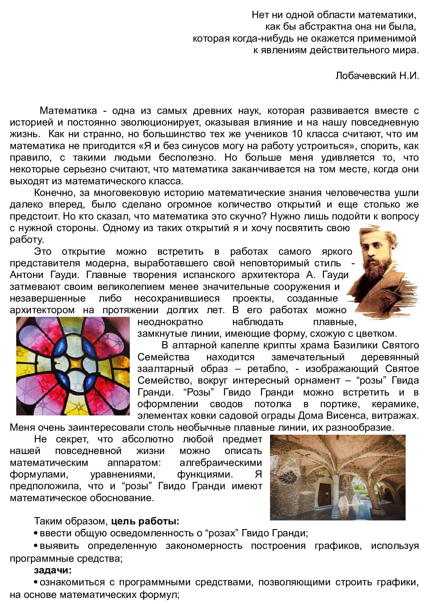 Тематика таких работ может быть расширена. Довольно много кривых, наблюдаемых нами можно задать математически. Работа раскрывает один из таких примеров. Работа интересна тем, что для построения применяются компьютерные технологии и процесс исследования становится динамичным и увлекательным. Это большое преимущество для такой темы.