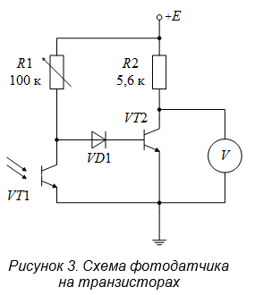Согласно приведенной схеме фототранзистор VT1, принимающий световой поток от источника световой энергии, выполняет роль фотодатчика. Фототранзистор VT1 переходит из закрытого состояния в открытое по мере нарастания фототока. Изменение фототока имеет пропорциональную зависимость по отношению к изменению освещенности базы фототранзистора VT1. Отображаемый измерительным прибором, включенным между коллекторным и эмиттерным выводами транзистора VT2, сигнал пропорционален освещенности. Регулировка чувствительности устройства осуществляется с помощью изменения сопротивления переменного резистора R1.