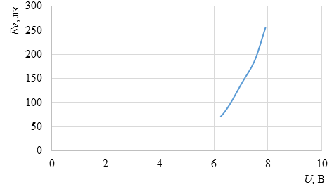 Результат исследования показал работоспособность спроектированного устройства. Как следует из графика зависимости освещенности от приложенного напряжения, градуировочная характеристика имеет линейную зависимость. Показания переводятся в люксы согласно градуировочному графику.