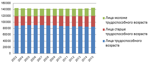 Рисунок 2 - населения по трудоспособности за 2002-2015 гг., тыс. чел.
