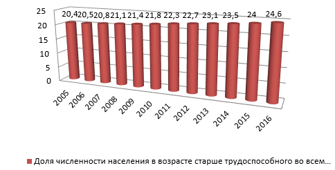На день России стабильную к старению. Так, с 2005 г., доля лиц трудоспособного увеличивается в на 0,4% в год и в 2016 году показатель 24,6% во всем населении. При этом сокращение лиц возраста и незначительное увеличение лиц трудоспособного возраста. Все это может свидетельствовать о том, что попала в «демографическую яму». По оценкам специалистов, в перспективе старения России еще характер.