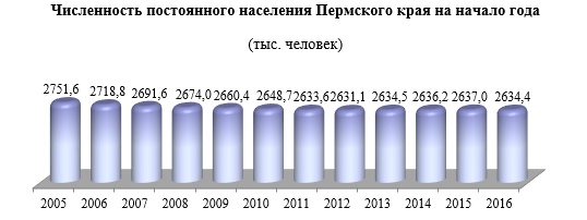 Начиная с 2012 и вплоть до 2015 года, в Пермском крае наблюдается рост численности населения. Однако, надо отметить, что с 2013 года темпы роста численности стали несколько замедляться. Под влиянием сложившегося миграционного оттока и, несмотря на позитивную динамику естественных процессов, в целом население Прикамья за 2015 год уменьшилось на 2623 человека. По оценке численность постоянного населения Пермского края на начало 2016 года она составила 2634409 человек.