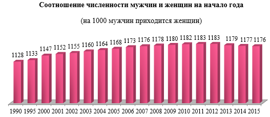 Таким образом, характерной чертой Прикамья остается существенная гендерная диспропорция. Численность мужчин на начало 2015 года составила 1211,7 тыс. человек, а женщин было больше на 213,6 тыс. человек (или на 17,6%). Корреляционная зависимость полов играет значительную роль в воспроизводстве населения, поскольку влияет на брачность и семейную структуру[9]. Население, в котором преобладают молодые люди, характеризуется высокой рождаемостью и низкой смертностью, поскольку молодые люди намного реже болеют и умирают, чем лица пожилого возраста. Анализ особенностей возрастной и гендерной структуры населения в тот или иной период времени, позволяет строить достаточно обоснованные предположения о будущих тенденциях рождаемости, смертности, других демографических процессов и воспроизводства населения в целом, и, следовательно, оценивать вероятности возникновения тех или иных проблем в экономической и социальной сферах (ил.6).