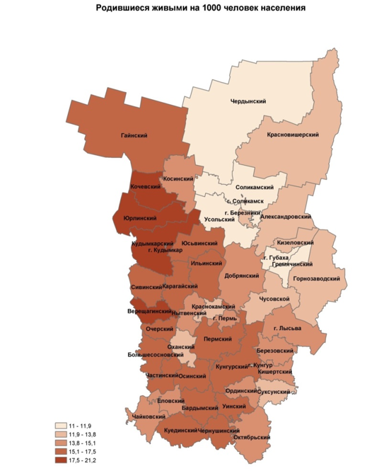 В 37 районах зафиксировано снижение рождаемости, причем в Александровском, Еловском, Косинском, Сивинском, Соликамском и Суксунском районах детей родилось на 20,5-25,7% меньше, чем в 2014 году. Также нужно отметить, что лишь на 17 территориях Прикамья число родившихся превысило число умерших, в остальных отмечался процесс естественной убыли населения. Коэффициент рождаемости выше общекраевого зафиксирован на