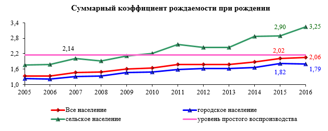 18,2-21,2 промилле - относятся Юрлинский, Верещагинский, Кочевский и Кудымкарский районы. В то же время, в 17 муниципальных районах и 4 городских округах рождаемость была ниже, чем в целом по краю, а самыми неблагополучными по этому показателю территориями можно назвать Губахинский городской округ, Соликамский и Усольский муниципальные районы, где на 1000 человек пришлось лишь 11,0-11,3 родившихся. Суммарный коэффициент рождаемости в Пермском крае в 2015 году составил 2,02 ребенка на женщину репродуктивного возраста, причем в городской местности он сложился на уровне 1,82, в сельской – 2,90. Величина среднекраевого показателя в анализируемом году и прогнозируемого (по среднему варианту прогноза) показателя на 2016 год, по-прежнему, складывается ниже уровня, обеспечивающего простое воспроизводство населения (не менее 2,14-2,15).