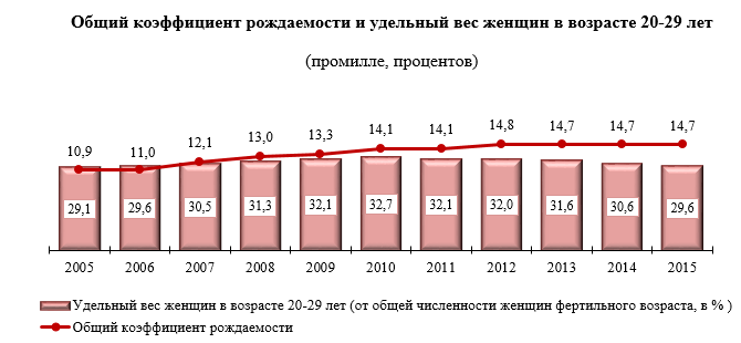 Одного лишь увеличения числа пар, официально зарегистрировавших брак, недостаточно для повышения рождаемости, так как рождения в семьях распределяются неравномерно[4]. Во-первых, рождение первенца следует ожидать через определенный промежуток после заключения брака. Во-вторых, семьи могут принять решение ограничиться одним ребенком, тогда рождение детей прекращается или становится менее вероятным. В результате возрастает процент первенцев среди родившихся. Таким образом, существует определенная зависимость между длительностью брака мужчины и женщины и сроком рождения ребенка. Обращает на себя внимание тот факт, что в первый год брака детей появляется на свет значительно больше, чем во второй, третий или последующие годы, что вполне естественно и объяснимо. Одной из основных предпосылок относительно стабильного уровня рождаемости, наблюдаемого в последнее время, явилось наличие достаточно значимого удельного веса женщин основных детородных возрастов (20-29 лет). Однако нужно отметить, что начиная с 2011 года, доля женщин этих возрастов в общей численности женщин фертильного возраста начала постепенно снижаться и в 2015 году составила 29,6%.