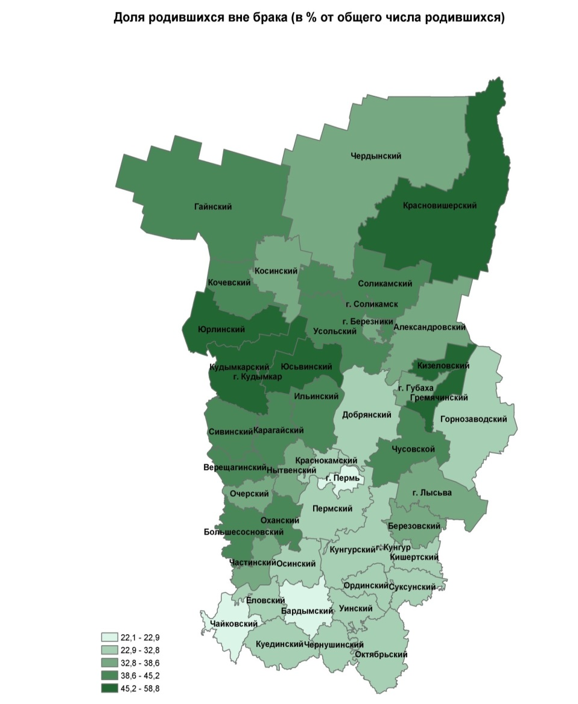 Весьма велика доля родившихся внебрачных детей в Кизеловском муниципальном районе, а также на территориях Коми-Пермяцкого округа, особенно в Кудымкарском и Юсьвинском районах (50,2-58,8%). Несмотря на то, что в целом по краю отмечалось снижение внебрачной рождаемости (на 5,0% в сравнении с 2014 годом), в округе этот показатель устойчиво высок.