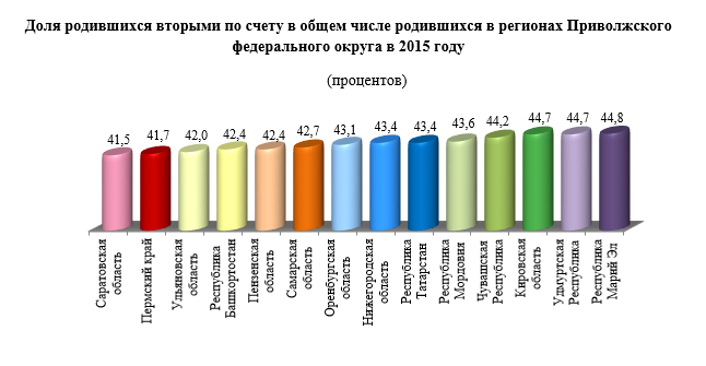 Сложившийся уровень рождаемости в последние годы в значительной мере связан и с государственными мерами поддержки стимулирующего характера и рядом социальных и экономических факторов сегодняшнего и завтрашнего дня. Программа «Материнский капитал», изначально рассчитанная на 10-летний период, заканчивается 31 декабря 2016 года. Прекращение действия данного механизма может негативным образом отразиться на уровне рождаемости. Осознавая социальную значимость данного вида государственной поддержки, Правительство изыскивает возможности продления действия программы[5]. В Прикамье в целях улучшения условий и повышения качества жизни населения принимаются специальные меры стимулирования рождаемости – это и развитие системы пособий в связи с рождением и воспитанием детей, обеспечение потребности семей в услугах дошкольного образования, доступность жилья для семей с детьми и т.п. На территории края в прошедшем году реализовывались целевые программы «Семья и дети Пермского края на 2011-2015 годы», «Обеспечение жильем молодых семей в Пермском крае», «Здоровье», «Молодежь Прикамья», «Развитие физической культуры, спорта, туризма и здорового образа жизни на 2011-2015 годы» и другие. В результате воплощения в жизнь механизмов по стимулированию рождаемости в последние годы все больше семей решается на рождение второго (или последующего) ребенка. Так, в анализируемом году число родившихся вторыми по счету детей составило 41,7% в общем числе новорожденных, в то время как в 2014 году таковых было 40,5%, в 2013 году – 38,8%, в 2012 году – 37,6%, а в 2011 году – 26,6%. Однако, в сравнении с другими субъектами, входящими в Приволжский федеральный округ, этот показатель в Прикамье не так уж и высок. Нужно отметить, что доля детей, родившихся вторыми по счету, выросла в сравнении с 2014 годом во всех субъектах ПФО[6].