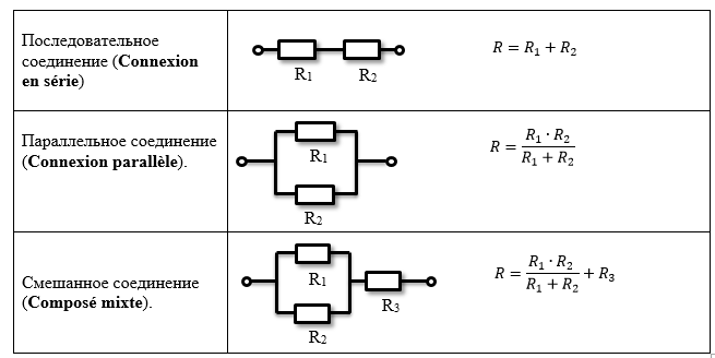 Таблица 1. Соединения сопротивлений (Les liaisons des résistances).