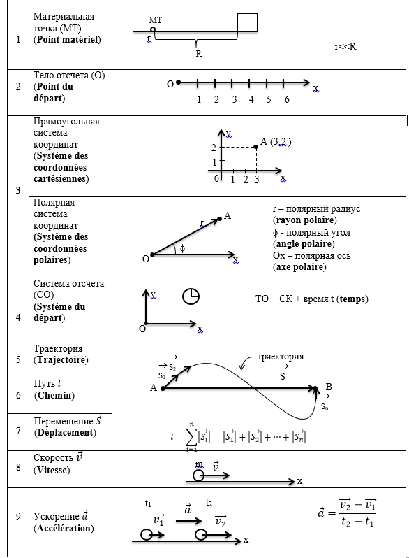 Таблица 2. Основы кинематики (Cinématiquedebase)