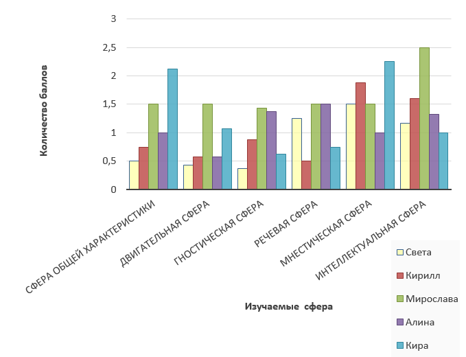 Наибольшее отставание в развитии в двигательной, гностической и интеллектуальной сфере показала Мирослава; в мнестической Кирилл; в речевой сфере Алина и Мирослава; в сфере общей характеристике Кира.