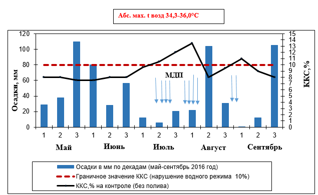 Экспериментальные данные показали, что при МДП поддерживается влажность почвы на оптимальном уровне (77,8 % от НВ в июле, 82,3% от НВ в 1-й декаде августа), тогда как на контроле в засушливый период она снизилась до 65 % от НВ в июле и 48,2% от НВ в 1-й декаде августа. Влажность почвы ниже 70 % от НВ называется влажностью замедления роста растений.
