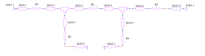 Цепи схемы MLIN 3 – MLIN 5 и MLIN 8 - MLIN 7 представляют собой шлейфы, для устранения вибраций в передающем тракте, сглаживания характеристик. Топология построенного широкополосного аттенюатора отображена на рисунке 2