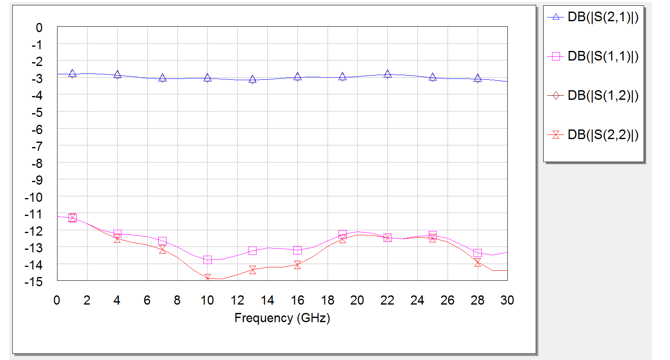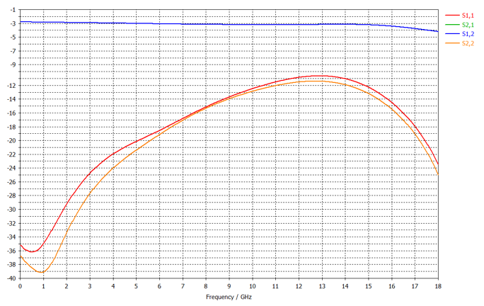 Результаты S- параметров спроектированного широкополосного аттенюатора отображены на рисунке 5