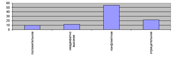 В экспериментальной группе подростков было выявлено несколько видов самоотношения: положительное ( у 10 % группы), отрицательное (у 22,5 %), неадекватно высокое (у 12,5 %) и конфликтное (у 55 %). Это наглядно представлено в гистограмме Рис. 1.