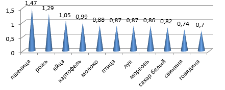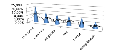 Наращивать следует значительные объемы сельскохозяйственной продукции, о чем свидетельствуют данные о продуктах – лидерах, импортируемых ранее в РФ (рис. 1).