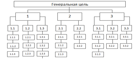 Метод «дерева целей» – метод, основанный на принципе разделения общей цели системы управления на подцели, которые, в свою очередь, делятся на цели нижележащих уровней. Данный метод играет важное значение при исследовании систем управления, так как деятельность организации сводится к достижению сформулированных целей. Необходимость использования данного метода обусловлена тем фактом, что «дерево целей» помогает получить устойчивую структуру целей, которая будет относительно стабильна на каком-то промежутке времени при происходящих изменениях [11].