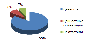 Второй и третий вопросы имели прямое отношение к нашему диссертационному исследованию, участникам предлагалось пояснить, «какой смысл вкладывается в понятие «ценность» и «ценностные ориентации», в ответе на четвертый вопрос эти понятия предлагалось соотнести. Как мы видим из диаграмм, большинство анкетируемых определило иерархию понятий «ценность» и «ценностные ориентации», отметив, что первое по своему охвату шире. Однако в ответах на второй и третий вопросы не все опрошенные смогли дать пояснение понятиям, но большинство представило содержательные варианты ответов. Так, при ответе на второй вопрос: «Какой смысл вкладывается по Вашему мнению в понятие ценность?» учителя поясняли: «…это то, что человеку дороже всего», «…то, что дорого, то, что важно», «…значимое для личности, общества (духовность, нравственность)», «Самое главное, то к чему стремишься - совершенство», «…что-то необходимое, без чего человеку трудно оставаться человеком», «стержень человеческой души». Ответы на третий вопрос были так же емкими: «это направление, верный ориентир на пути к постижению ценностей», «пути достижения того, что важно», «это то, к чему мы должны стремиться», «это то, на что опираешься при стремлении к совершенству», «это «нацеливание» на достижение ценностей», «направленность личности на пути к ценностям».