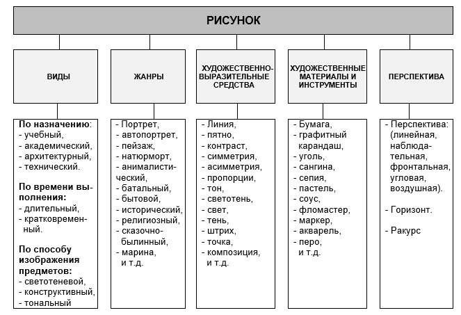 В результате изучения специальной литературы по рисунку следует отметить, что тема «Рисунок» состоит из пяти крупных разделов: виды, жанры, художественно-выразительные средства, художественные материалы, перспектива. Каждый из разделов представлен группой понятий.