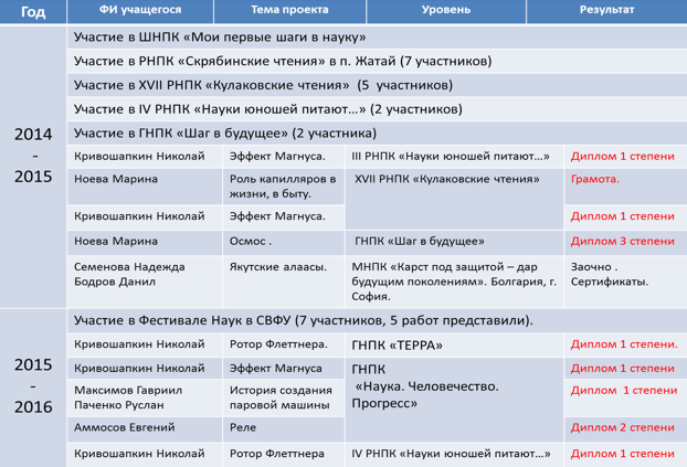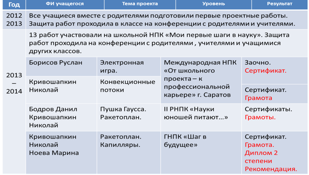 За период работы над этой темой, учащиеся моего класса, на базе которого была открыта площадка, по реализации проекта, с прошлого года стали призёрами и победителями муниципального, городского, регионального, а затем республиканского туров научно-практических конференций. Разработаны рекомендации по курсу преподавания физики с использованием проектно-исследовательской деятельности на уроках и внеурочной деятельности учащихся.