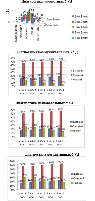 По диаграммам видно, что использование технологии интеллект-карт повышает уровень универсальных учебных действий у младших школьников.